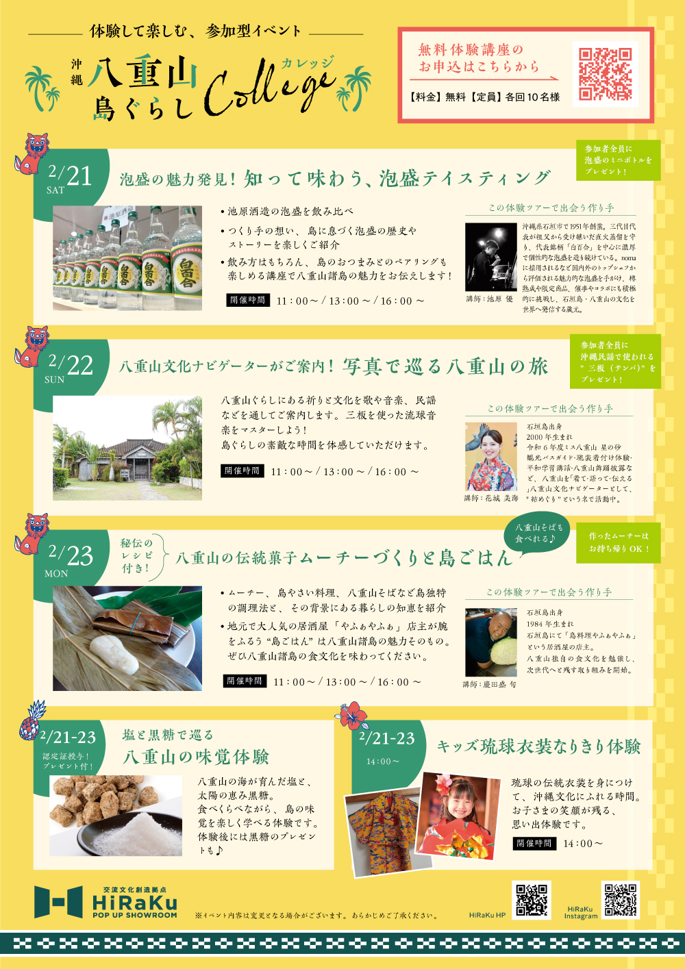 講座は全て無料。まるで八重山を旅しているような、心ほどけるひとときをお楽しみください。